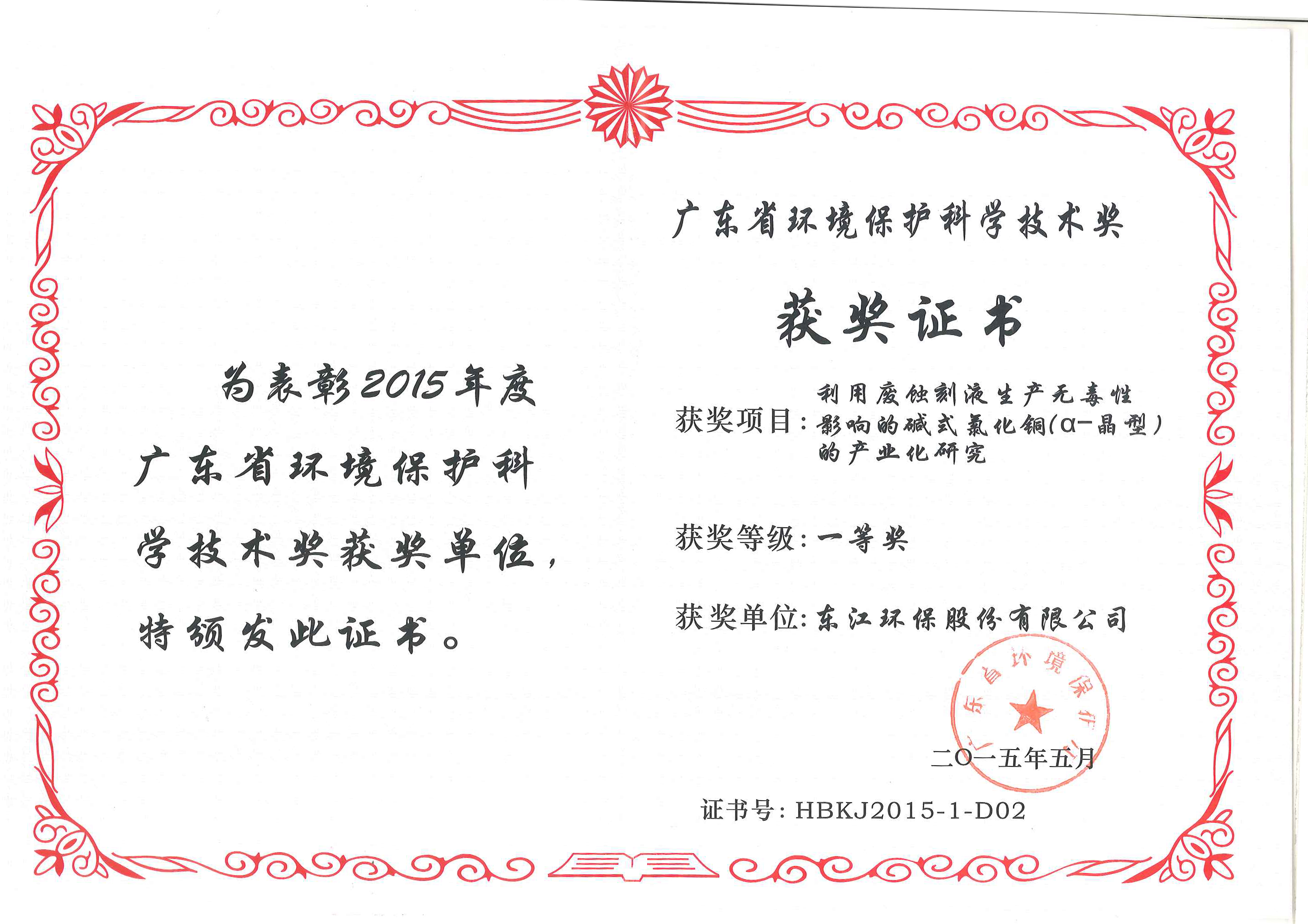 2015年5月 廣東省環(huán)境保護科學技術獎(利用廢蝕刻液生產無毒性影響的堿式氯化銅的產業(yè)化研究一等獎)