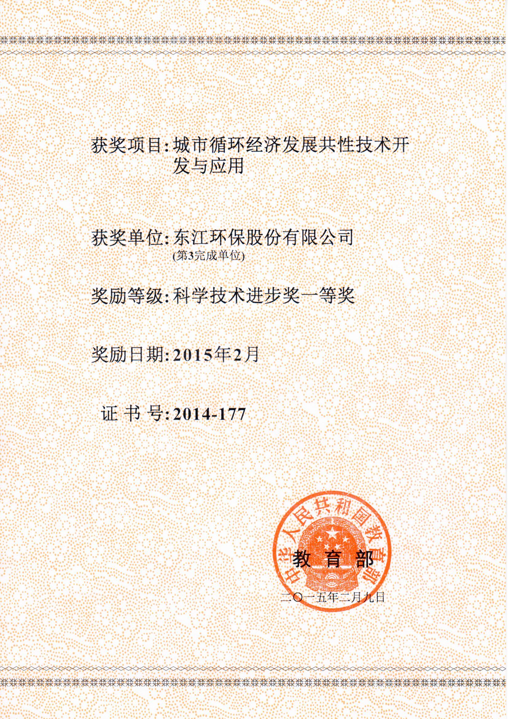 2015年2月 科學技術進步獎一等獎(城市循環(huán)經濟發(fā)展共性技術開發(fā)與應用)